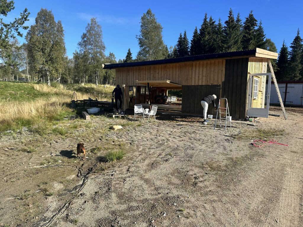 Saghuset ble ferdig høsten 2024 – med god hjelp av Julian og Even. Beising av huset har mamma Tove og pappa Hans Normann tatt ansvaret for.